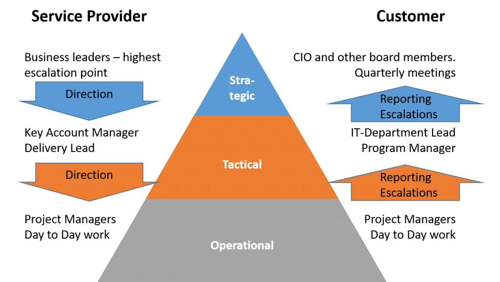 On the strategic level, the senior management (CIO and Business unit lead) need to discuss the long term planning – looking back at the performance during the last months, and then giving direction about the targets to be achieved in the coming quarters. a common schedule for those “Steering Meetings” is about once a quarter, during a transition when there is lots and lots of change, also more frequent. This meeting will also ensure that all escalations and issues are solved. Further, all extensions, large scope changes (like a new set of applications to maintain, or a new platform to operate) will be discussed and agreed here.